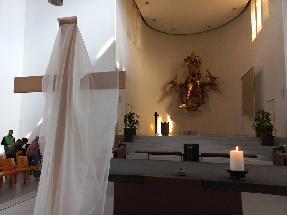Karfreitagsliturgie: Wortgottesdienst, Kreuzverehrung (Musik: Simone M. Bösch, Querflöte, Kantor: Arno Fitz)