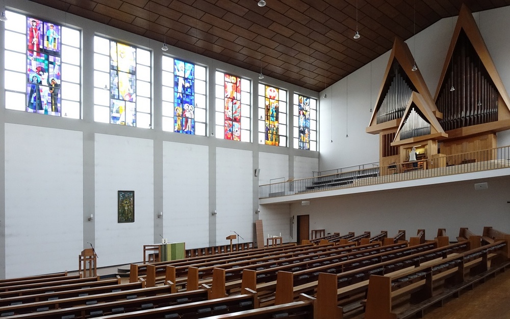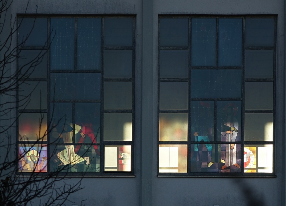 Glasfenster Hauptraum, oberes Drittel beider Wände, 9 Stück an Südwand, 8 an Nordwand, Entwurf Heinrich Stäubli, St. Gallen, 1959, Tiroler Glasmalereinastalt, Innsbruck