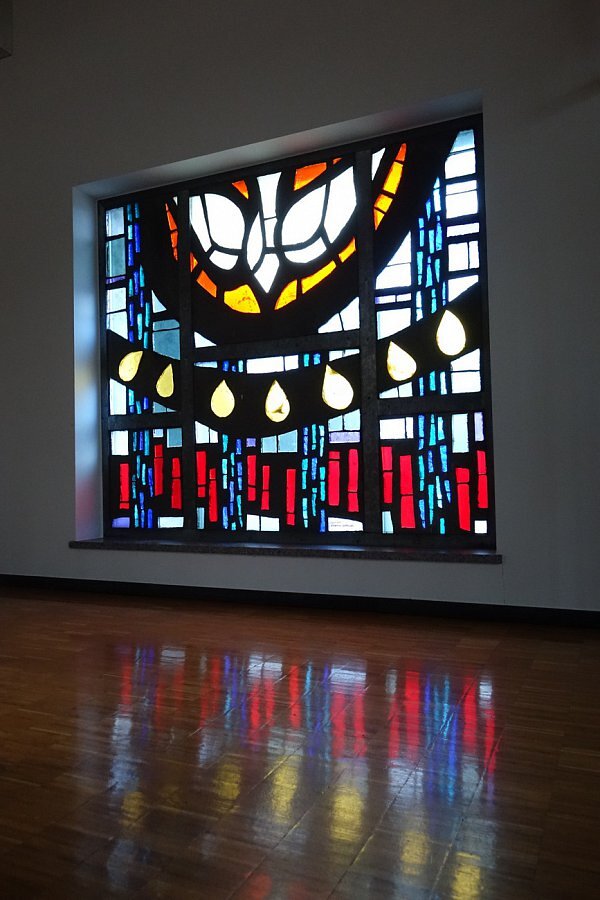 Glasfenster Südfront, Werktagskapelle von Hannes Bertle, Schruns, um 1959, laut Wettbewerb als "gegenstandslose Farbmalerei", Ausführung, Tiroler Glasmalereianstalt, Innsbruck