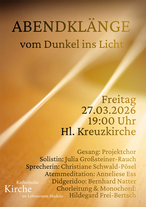 27.03.2026, 19:00 Uhr, Bludenz, Pfarrkirche Hl. Kreuz Abendklänge - vom Dunkel ins Licht An diesem Abend laden wir Sie ein, einerseits den Liedern, Klängen und Texten zu lauschen und andererseits die eigene... Mehr lesen