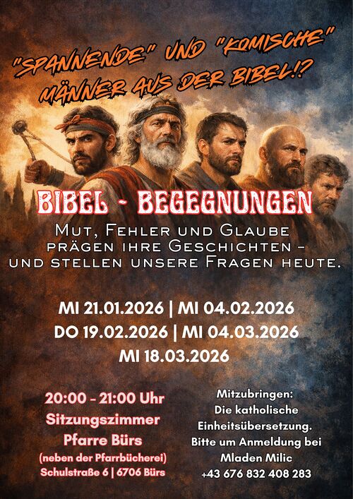 18.03.2026, 20:00 Uhr, Bürs, Sitzungszimmer der Pfarre Bürs (neben der Bücherei) Bibel-Begegnung zum Thema "Spannende und komische Männer aus der Bibel" Mehr lesen