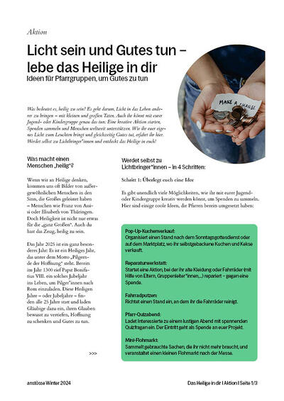 Was bedeutet es, heilig zu sein? Es geht darum, Licht in das Leben anderer zu bringen – mit kleinen und großen Taten. Auch ihr könnt mit eurer Jugend- oder Kindergruppe genau das tun: Eine kreative Aktion starten, Spenden sammeln und Menschen weltweit unterstützen. Wie ihr euer eigenes Licht zum Leuchten bringt und gleichzeitig Gutes tut, erfahrt ihr hier. Werdet selbst zu Lichtbringer*innen und entdeckt das Heilige in euch!
